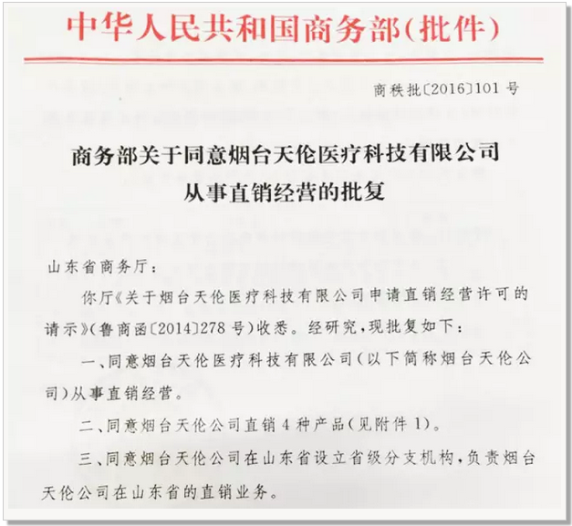 【直报网北京2月1日讯】(第一直销网)2016年是我国十三五规划的开篇之年,也是金天国际第一个30年规划六五计划的开篇之年,金天国际作为立志弘扬中医生态型养生文化的民族企业,25年来立足于专业研发、生产和推广生态型健康产品,以加速实现生态保养产业化,让更多的生命充满活力为使命,并得到了国家的高度重视和各方面的支持。金天国际之核心企业天伦医疗科技正式接到商务部批复:荣获国家十三五规划开篇之年的首张直销许可证!