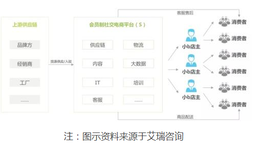 会员制社交电商起源于个人代购及微商,在2015年微商被社会舆论诟病的同时,会员制社交电商承接了这部分微商流量,成为店主。会员制社交电商是个人微商的升级和进化。会员制电商将微商的多级分销体系融入到产品中,凭借其强大的分销和带货能力是由电商进入爆发增长期。 会员制社交电商通过模式设计,包括分成拉新体系、商品销售返佣、会员成长制度,构建了自发式的拉新推广模型,封闭的会员体系,会员的粘性和忠诚度也显著高于普通电商平台。 通过社群网络效应与供应链优势,会员制社交电商打造了独特的“私域流量”。 二、社交电商的模式解析 会员制社交电商是指在社交的基础上,以S2b2c的模式连接供应商与消费者实现商品流通的商业模式。平台方解决供应链物流售后,以及培训等一系列服务。小b店主只需要负责拉新推广,把商品卖出去。其他的都交给平台方来服务。平台美其名曰“零成本创业”,打着“自用省钱、分享赚钱”的口号,吸引了一波又一波会员加入。