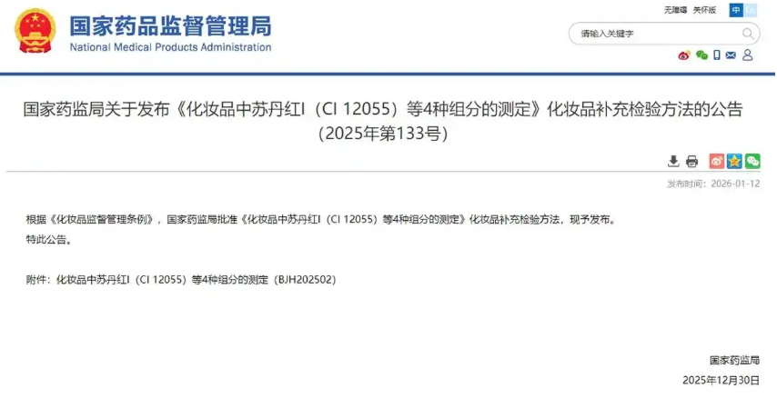 【直报网北京1月14日讯】(中新网)国家药监局近日批准《化妆品中苏丹红I(CI 12055)等4种组分的测定》化妆品补充检验方法,该方法适用于液体(水、油)类、膏霜乳类、粉剂类、块状类、蜡基类化妆品中苏丹红Ⅰ、苏丹红Ⅱ、苏丹红Ⅲ、苏丹红Ⅳ的含量测定。