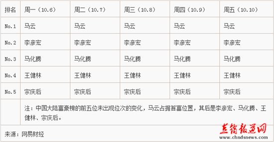 【直报网10月13日讯】(网易财经)网易财经从福布斯The World's Billionaires[全球亿万富翁财富榜]了解到,在上周(2014年10月6日—2014年10月10日)的富豪排行榜中,中国富豪榜的前五位没有发生位次的变化,排名为马云、李彦宏、马化腾、王健林、宗庆后。排名前五位的富豪中,马化腾的财富变化最大,其个人财富在10月6日上涨6.61亿美元,涨幅为4.4%;10月10日,其财富下跌3.427亿美元(约合20.9亿人民币),在上周中国富豪榜单中缩水最大。 全球财富榜中,前五位依然是卡洛斯、比尔•盖茨、巴菲特、阿曼西奥·奥特加、拉里·埃里森。其中,财富缩水最大的是巴菲特和阿曼西奥·奥特加,10月10日同缩水13亿美元;财富增长最大的也是巴菲特,其个人财富在10月9日增长16亿美元。 网易财经一周(10.6-10.10)全球财富榜_中国前5名 上榜的中国富豪中,财富涨幅最大的是华策影视董事长傅梅城,其个人财富在周五(10日)上涨56%,为18亿美元,并以33亿美元排在中国第33位,世界第508位。跌幅最大的是深圳市立业集团董事长林立,其个人财富在10月7日下跌7.7%,为1.04亿美元。 据福布斯数据显示,10月7日,美国有线电视教父约翰·马龙个人财富上涨8.31亿美元,排在第一位。法国 Altice董事会执行主席帕特里克·德拉希上涨4.22亿美元,排在第二位。香港周大福珠宝主席郑裕彤上涨1.66亿美元,排在第三位。澳洲矿业大亨吉娜·莱因哈特上涨1.58亿美元,排在第四位。海亮集团董事局主席冯海良上涨1.55亿美元,排在第五位。财富缩水方面,戴尔公司董事会主席迈克尔·戴尔排在缩水榜单的第一位,当日缩水41亿美元。印度太阳制药创始人迪利普·桑哈维财富缩水4.94亿美元,排在第二位。日本迅销有限公司主席柳井正缩水4.79亿美元,排在第三位。欧莱雅公司女继承人利利亚纳·贝当古排在第四位,当日财富缩水4.24亿美元。巴西啤酒酿出的亿万富翁豪尔赫·保罗·雷曼缩水4.23亿美元,排在第五位。 |