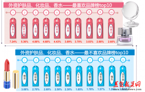 【直报网3月16日讯】(环球网综合)日前环球网联合环球舆情调查中心,再次围绕网民对衣食住行用的外资品牌好感度连续第五年展开特别调查。调查显示,受访者最喜欢的护肤品、化妆品、香水外资品牌是香奈儿,有7.24%的受访者表示最喜欢香奈儿品牌。雅诗兰黛在受访者中喜爱度排在第二位,提及率为5.36%。欧莱雅以4.88%的提及率排位第三位。 在受访者最不喜欢的外资护肤品、化妆品、香水品牌榜单中,雅芳排名榜首,其次为欧珀莱,香奈儿排名第三位,提及率分别为3.08%、2.70%和2.69%。 值得注意的是,尽管香奈儿在外资护肤品、化妆品、香水品牌红榜与黑榜排名前列,但其好感度净值(即最喜欢比例减去最不喜欢比例)为4.55%,位列好感度第一名。此外,雅诗兰黛也以4.49%的好感度度净值成为好感度第二位的外资护肤品、化妆品、香水。▲ (原标题:外资护肤化妆品调查:香奈儿夺冠 雅芳垫底) 责任编辑:小申 |