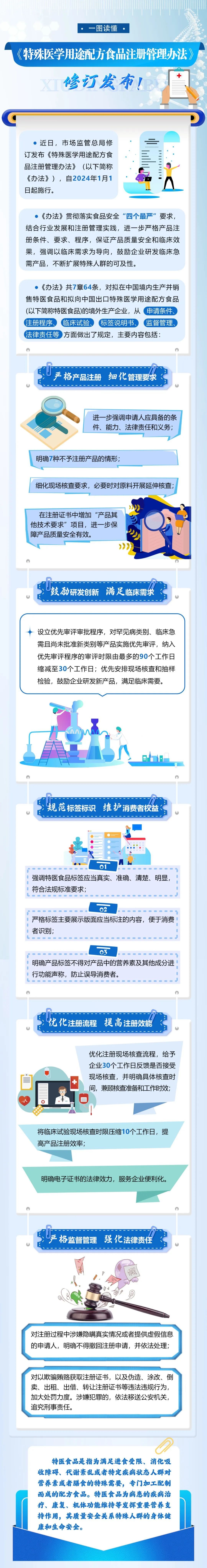 【直报网北京12月5日讯】(市说新语)近日,国家市场监督管理总局修订发布《特殊医学用途配方食品注册管理办法》(以下简称《办法》),自2024年1月1日起施行。 特殊医学用途配方食品(以下简称特医食品)是指为满足进食受限、消化吸收障碍、代谢紊乱或者特定疾病状态人群对营养素或者膳食的特殊需要,专门加工配制而成的配方食品。特医食品为病患的疾病治疗、康复、机体功能维持等发挥重要营养支持作用,其质量安全关系特殊人群的身体健康和生命安全。 《办法》贯彻落实食品安全“四个最严”要求,结合行业发展和注册管理实践,进一步严格产品注册条件、要求、程序,保证产品质量安全和临床效果,强调以临床需求为导向,鼓励企业研发临床急需产品,不断扩展特殊人群的可及性。 《办法》共7章64条,对拟在中国境内生产并销售特医食品和拟向中国出口特医食品的境外生产企业,从申请条件、注册程序、临床试验、标签与说明书、监督管理、法律责任等方面作出规定,主要内容包括: 一是严格产品注册,细化管理要求。进一步强调申请人应具备的条件、能力、法律责任和义务;明确7种不予注册产品的情形;细化现场核查要求,必要时对原料开展延伸核查;在注册证书中增加“产品其他技术要求”项目,进一步保障产品质量安全有效。 二是鼓励研发创新,满足临床需求。设立优先审评审批程序,对罕见病类别、临床急需且尚未批准新类别等产品实施优先审评,审评时限由最多的90个工作日缩减至30个工作日,优先安排现场核查和抽样检验,鼓励企业研发新产品,满足临床需要。 三是规范标签标识,维护消费者权益。强调特医食品标签应当真实、准确、清楚、明显,符合法规标准要求;严格标签主要展示版面应当标注的内容,便于消费者识别;明确产品标签不得对产品中的营养素及其他成分进行功能声称,防止误导消费者。 四是优化注册流程,提高注册效能。优化注册现场核查流程,给予企业30个工作日反馈是否接受现场核查,并明确具体核查时间,兼顾核查准备和工作时效;将临床试验现场核查时限压缩10个工作日,提高产品注册效率;明确电子证书的法律效力,服务企业便利化。 五是严格监督管理,强化法律责任。对注册过程中涉嫌隐瞒真实情况或者提供虚假信息的申请人,明确不得撤回注册申请,并依法处理。对以欺骗贿赂获取注册证书,以及伪造、涂改、倒卖、出租、出借、转让注册证书等违法违规行为,加大处罚力度。涉嫌犯罪的,依法移送公安机关,追究刑事责任。