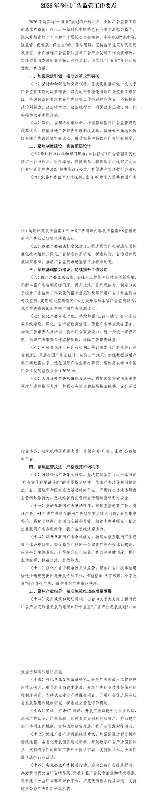 如何在守住“三品一械”安全底线的同时,让审查制度真正适配新时代的传播逻辑,避免“一刀切”抑制创新或导致合规成本畸高,是对监管智慧的重大考验。 ![]() (原标题:总局发布《2026年全国广告监管工作要点》) 责任编辑:一一 【特别声明:部分文字及图片来源于网络,仅供学习和交流使用,不具有任何商业用途,其目的在于传递更多的信息,并不代表本平台赞同其观点。版权归原作者所有,如涉版权或来源标注有误,请及时和我们取得联系,我们将迅速处理,谢谢!】 解读新闻热点、呈现敏感事件、更多独家分析,尽在以下微信公号,扫描二维码免费阅读。