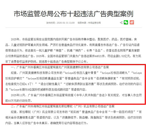 庶正观点 【直报网北京2月3日讯】(庶正康讯)政府干预的出发点是纠正市场失灵!我国营养健康市场长期徘徊在失灵临界点两侧,因此严格监管是优化营商环境的必要之举! 近年来,互联网广告形式发生变化,再加上精准推送、直播带货、内容种草、信息流深度植入等经营模式、投放方式等方面不断发展变化,多样性、多元性、广泛性的特征更趋明显。 国家市场监督管理总局近期公布了“十起违法广告典型案例”及“第五批直播电商领域典型案例”,不仅揭示了监管重点,更为行业敲响了合规警钟。 01.平台承担广告发布者主体责任 ![]() 庶正点评:此案强调了平台作为广告发布者的法定责任。平台必须建立与监管要求匹配的审核机制,对“三品一械”等特殊商品广告实施实质性审查,确保广告内容与批准文件一致。 02.跨境“保健品”广告违法被重罚 ![]() 庶正点评:虽然跨境电商渠道进口的食品作为“个人物品”在产品质量责任上可能与传统进口模式有差异(消费者风险自担),但其在中国境内进行的广告宣传活动,也必须遵守中国的广告管理规则。运营方明知是普通食品,却在中国市场宣传功能或治疗作用,是明确的违法行为。60万元的高额处罚,也是对跨境电商行业发出了一个重要警示。 03.以直播形式发布广告涉“病” ![]() ![]() 庶正点评:《直播电商监督管理办法》于2月1日落地施行,标志着直播营销正式迈入全链条合规新阶段。新规明确了直播内容构成商业广告的三种情形,通过厘清“广告”与“营销”的边界,从而在制度层面解决了监管不确定性问题。 04.普通食品广告违规仍是“重灾区” 除前述广告违法行为外,案例中不乏大量“保健品”(普通食品身份)夸大、虚假宣传的情况。 如: ![]() ![]() ![]() 庶正点评:普通食品宣传治疗功效、保健功能都是绝对禁区。无论营销形式如何翻新(短视频、私域社群、伪科普),任何试图“包装”或“暗示”疗效的做法都极其危险。监管部门的穿透式执法能力日益增强,任何隐蔽的渠道都难逃法眼。 END