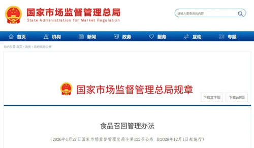 庶正观点 【直报网北京2月13日讯】(中消报)政府干预的出发点是纠正市场失灵!我国营养健康市场长期徘徊在失灵临界点两侧,因此严格监管是优化营商环境的必要之举! 2月11日,国家市场监督管理总局发布《食品召回管理办法》(以下简称《办法》)。与现行《办法》相比,新《办法》全面压实食品生产经营者主体责任和市场监管部门监管责任,对加强食品召回监管明确新要求,新《办法》将于2026年12月1日实施。 ![]() 与现行办法相比,新修订的办法压实食品生产经营者主体责任、明确各级市场监管部门监管职责、完善召回等级分级情形、加大惩戒力度。 其中,新修订的办法明确要求食品生产经营者应当建立并实施食品召回管理制度,规定食品经营者、食品集中交易市场开办者、食品经营柜台出租者、食品展销会举办者及网络食品交易第三方平台提供者有配合召回义务。 此外,新修订的办法完善召回等级分级情形,以食品安全危害程度、需要实施召回的紧急程度等为依据,明确三级召回情形,并差别化设置各级召回启动时限,将召回的启动时限由24、48、72小时调整为24、36、48小时,提高针对性风险防控效果,增强食品召回的可操作性。 据庶正康讯了解,去年9月征求意见稿中提出:“未按规定注册,或未按照注册的产品配方、生产工艺等技术要求生产的保健食品、特殊医学用途配方食品和婴幼儿配方食品”应纳入一级召回;此外,还以单独条款明确了进口食品商、跨境电商等相关主体的召回义务与责任。不过,这些内容均未出现在新《办法》中。 食品召回管理办法 (2026年1月27日国家市场监督管理总局令第122号公布 自2026年12月1日起施行) 第一章 总 则 第一条 为了加强食品(含食品添加剂,下同)生产经营管理,防控食品安全风险,保障公众身体健康和生命安全,根据《中华人民共和国食品安全法》及其实施条例等法律、行政法规,制定本办法。 第二条 在中华人民共和国境内,实施食品召回、处理及其监督管理,适用本办法。 第三条 食品生产经营者发现其生产经营的食品不符合食品安全标准或者有证据证明可能危害人体健康的,应当立即停止生产经营,依法实施召回。 第四条 食品生产经营者应当对其生产经营食品的安全负责,建立并实施食品召回管理制度,收集、分析食品安全信息,依法实施食品召回和处理,落实食品安全主体责任。 第五条 国家市场监督管理总局负责组织、指导全国食品召回和处理的监督管理工作。 省级市场监督管理部门负责组织、指导本行政区域内食品召回和处理的监督管理工作。 省级市场监督管理部门负责对本级和设区的市级市场监督管理部门许可的食品生产经营者实施食品召回和处理进行监督管理;设区的市级市场监督管理部门负责对县级市场监督管理部门许可、备案的食品生产经营者实施食品召回和处理进行监督管理。 第六条 国家市场监督管理总局缺陷产品召回技术中心、省级市场监督管理部门所属技术机构具体承担食品召回和处理的信息监测、技术调查、风险分析、效果评估等技术支撑工作。 第七条 鼓励和支持食品行业协会加强行业自律,制定行业规范,引导和督促食品生产经营者依法履行食品召回和处理义务。 鼓励食品生产经营者参加食品召回相关的食品安全责任保险。 鼓励社会公众对食品召回和处理相关行为进行监督。 第二章 食品召回的实施 第八条 食品生产者通过食品安全自查、消费者投诉、相关生产经营者通知、监督管理部门告知等方式发现其生产的食品属于本办法第三条规定情形的,应当立即停止生产,主动实施召回。 食品经营者发现其经营的食品有本办法第三条规定情形的,应当立即停止经营,通知相关生产经营者和消费者,并记录停止经营和通知情况。由于食品经营者的原因造成其经营的食品有本办法第三条规定情形的,食品经营者应当主动实施召回。 以委托方式生产的食品有本办法第三条规定情形的,由委托方实施召回,受托方应当配合。 第九条 根据食品安全风险的严重和紧急程度,食品召回分为三级。 食品可能导致急性中毒、亚急性中毒、严重健康损害或者死亡,需要控制食品安全风险的,应当启动一级召回。 食品可能导致慢性中毒、一般健康损害,需要控制食品安全风险的,应当启动二级召回。 食品存在其他不符合食品安全标准的情形,需要控制食品安全风险的,应当启动三级召回。 第十条 食品生产经营者实施召回的,应当确定召回等级,制定召回计划,向相关生产经营者发出召回通知,通过本单位网站、相关媒体等能够让相关公众知晓的方式向社会发布召回公告,并向本办法第五条第三款规定的市场监督管理部门报告召回计划。 食品生产经营者确认食品未销售至消费者且能通过召回通知实施召回的,可以不向社会发布召回公告。 第十一条 食品生产经营者应当按照确定的召回等级,在本条第二款规定时限内完成本办法第十条规定的召回启动各项工作。 属于一级召回的,食品生产经营者应当在发现食品安全风险后24小时内完成召回启动;属于二级召回的,应当在发现食品安全风险后36小时内完成召回启动;属于三级召回的,应当在发现食品安全风险后48小时内完成召回启动。 第十二条 召回计划应当包括下列内容: (一)实施召回的食品生产经营者的名称、地址、生产经营许可证编号或者