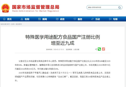 ![]() 【直报网北京2月27日讯】(人民日报)记者近日从市场监管总局食品审评中心获悉:特殊医学用途配方食品国产注册占比从2020年的49%增至2025年的88%。 肿瘤全营养配方、增稠组件等以往依赖进口的品类陆续转为国产注册上市,市场规模从2020年的70亿元增至2024年的230亿元,年均复合增长率超过25%。