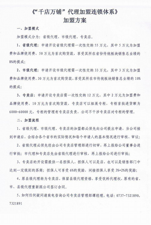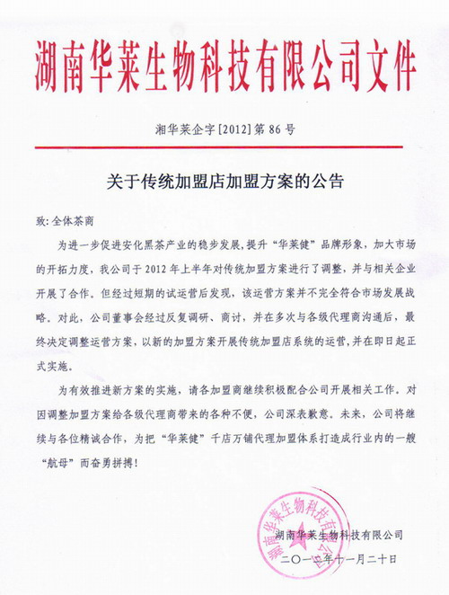 直报网北京11月22日电(本站记者报道)记者从华莱官方网站获悉,湖南华莱生物科技有限公司为进一步促进安化黑茶产业的稳定发展,提升“华莱健”品牌形象,决定调整运营方案,以新的加盟方案开展传统加盟店系统的运营,并在即日起正式实施.