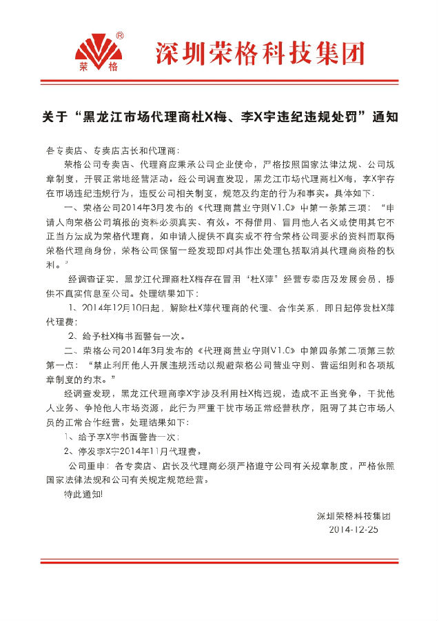 【直报网12月26日讯】(荣格)12月25日,荣格发布关于“黑龙江市场代理商杜X梅、李X宇违纪违规处罚”的通知,详情如下: