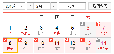 【直报网1月28日讯】(直报网总编室)根据国务院办公厅部分节假日安排的通知精神,直销报道网2016年春节放假安排如下: 1月7日(除夕)——1月13日(正月初六)放假七天,1月14日(正月初七)正常上班。 直销报道网全体工作人员祝愿辛勤耕耘的直销人以及全国人民新春快乐,祝愿大家猴年吉祥,和和美美,幸福安康! 春节 春节是中国最富有特色的传统节日,中国人过春节已超过4000多年的历史,关于春节的起源有多种说法,但其中普遍接受的说法是春节由虞舜时期兴起。春节一般指正月初一,是一年的第一天,又叫阴历年,俗称“过年”;但在民间,传统意义上的春节是指从腊月的腊祭或腊月二十三或二十四的祭灶,一直到正月十九,其中以除夕和正月初一为高潮。在春节期间,中国的汉族和一些少数民族都要举行各种活动以示庆祝。 这些活动均以祭祀祖神、祭奠祖先、除旧布新、迎禧接福、祈求丰年为主要内容。春节的活动丰富多彩多姿,带有浓郁的各民族特色。受到中华文化的影响,属于汉字文化圈的一些国家和民族也有庆祝春节的习俗。 责任编辑:小申 解读新闻热点、呈现敏感事件、更多独家分析,尽在“直事儿”微信,扫描二维码免费阅读。