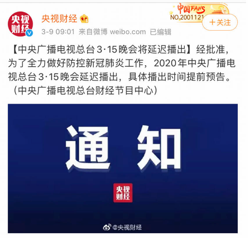 【直报网北京3月11日讯】(央视财经)3月9日,中央广播电视总台财经节目中心在其官方微博宣布,经批准,为了全力做好防控新冠肺炎工作,2020年中央广播电视总台315晚会延迟播出,具体播出时间提前预告。 (原标题:央视财经:受疫情影响315晚会延迟播出) 责任编辑:蓝莓 【特别声明:部分文字及图片来源于网络,仅供学习和交流使用,不具有任何商业用途,其目的在于传递更多的信息,并不代表本平台赞同其观点。版权归原作者所有,如涉版权或来源标注有误,请及时和我们取得联系,我们将迅速处理,谢谢!】 解读新闻热点、呈现敏感事件、更多独家分析,尽在以下微信公号,扫描二维码免费阅读。