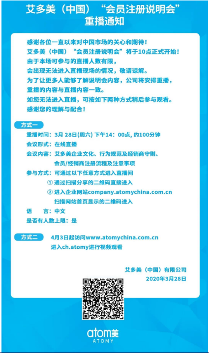 【直报网北京4月23日讯】(艾多美中国) 艾多美(中国)“会员注册说明会” 重播通知 感谢各位一直以来对中国市场的关心和期待! 艾多美(中国)“会员注册说明会”将于10点正式开始!由于本场可参与的直播人数有限, 会出现无法进入直播现场的情况,敬请谅解。 为了让更多人能够了解说明会内容,公司将安排重播,重播的内容与直播内容一致。 如您无法进入直播,可按如下两种方式稍后参与观看。感谢您的理解与配合 方式一 重播时间:3月28日(周六)下午14:00点,约100分钟 会议形式:在线直播 会议内容:艾多美企业文化、行为规范及经销商守则、 会员/经销商注册流程及注意事项 参与方式:可通过以下任意方式进入直播间 ①通过扫描分享的二维码直接进入 ②进入企业网站company.atomychina.com.cn扫描网站首页显示的二维码进入 语言:中文 是否有人数上限:是 方式ニ 4月3日起访问NWW.atomychina.com.cn 进入ch. atomy进行视频观看 艾多美(中国)有限公司