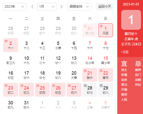 【直报网北京12月31日讯】(直报网总编室)根据国务院办公厅部分节假日安排的通知精神,直销报道网2023年元旦放假安排如下: 2022年12月31日(周六)---------2023年1月2日(周一)属于国家法定节假日,放假3天。 2023年1月3日(周二)正式上班。 直销报道网全体工作人员祝愿大家元旦快乐! 元旦简介: 在当代,元旦指公元纪年的岁首第一天(即1月1日)。自西历传入我国以后,元旦一词便专用于新年,传统的旧历年则称春节。 而在此之前,元旦一直是指农历岁首第一天的。元是“初”“始”的意思,旦指“日子”,元旦合称即是“初始的日子”,也就是一年的第一天。 元旦来历: