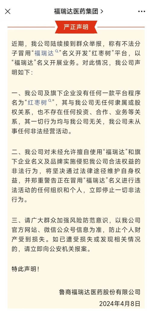 三、请广大群众加强风险防范意识,以我公司官方网站、微信公众号信息为准,防止个人财产受到损失。如已遭受损失或发现相关情况的,请立即向公安机关报案。 特此声明! 鲁商福瑞达医药股份有限公司 2024年4月8日 ![]() (原标题:福瑞达发声明了:“红枣树”平台与我司无关!) 责任编辑:一一 【特别声明:部分文字及图片来源于网络,仅供学习和交流使用,不具有任何商业用途,其目的在于传递更多的信息,并不代表本平台赞同其观点。版权归原作者所有,如涉版权或来源标注有误,请及时和我们取得联系,我们将迅速处理,谢谢!】 解读新闻热点、呈现敏感事件、更多独家分析,尽在以下微信公号,扫描二维码免费阅读。
