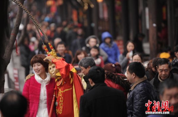 2月11日,一位打扮成孙悟空造型的街头艺人出现在重庆千年古镇磁器口,受到众多市民关注。▲ (原标题:孙悟空现身重庆千年古镇磁器口) 责任编辑:王