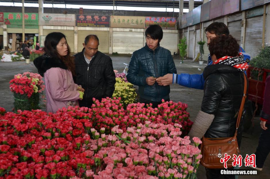 2月12日,昆明斗南花卉市场一片忙碌景象。随着元宵节、情人节两节将至,加上冬季以来云南鲜花连遭霜冻灾害,云南鲜切花近期销售价格出现暴涨。图为