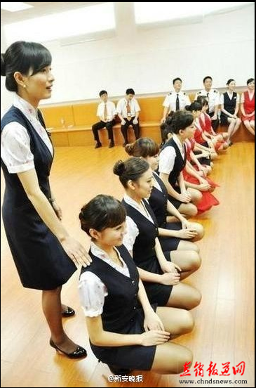 【直报网9月13日讯】(凤凰网)蹲式服务旨在突出顾客是上帝的宗旨,让顾客能够感受到自己被充分的尊重,在航空飞机上指乘务员为旅客提供服务时采用蹲姿,就是在蹲下的同时,膝盖保持一上一下,上身保持挺直,下蹲深度应以能够使顾客平视或略俯视自己为宜。▲ |