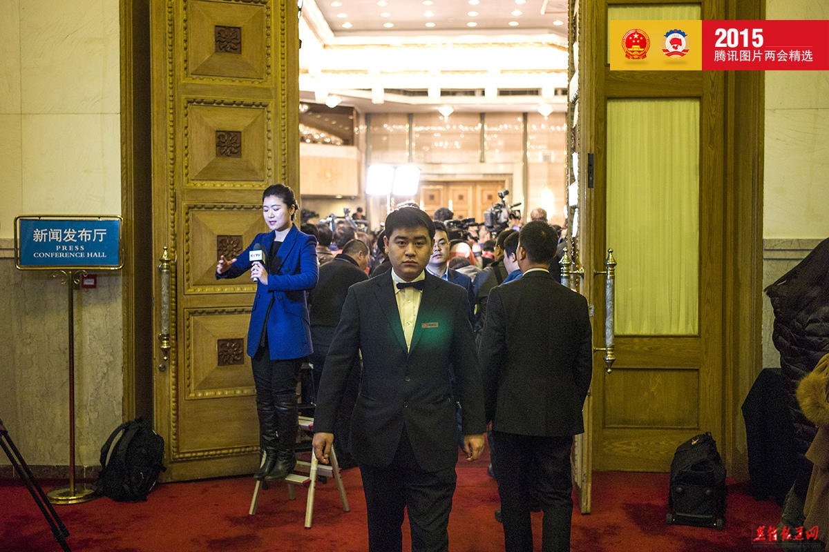 2015年3月4日,北京人民大会堂,一名女记者站在椅子上报道十二届全国人大三次会议新闻发布会。