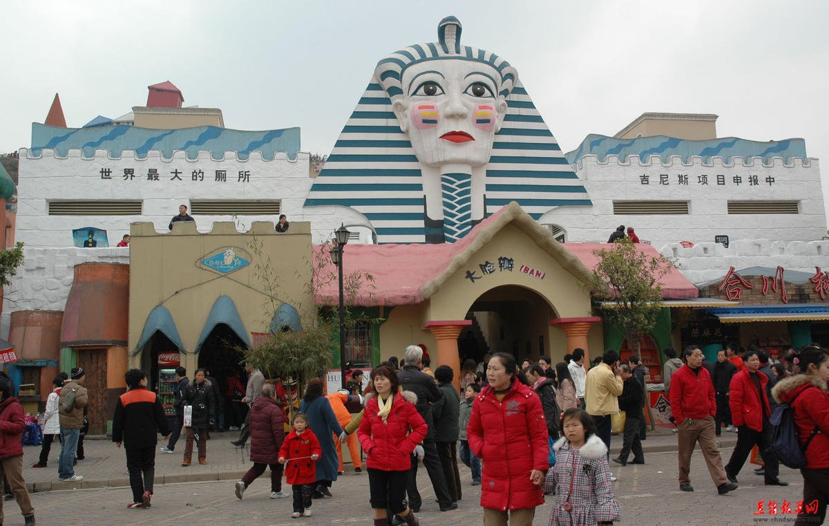 2008年春节,重庆市洋人街新建千人大公厕正式接待游客。这座自称“最牛的厕所”是根据山地形态绕山而建,采用古城堡建筑城墙式卫生间,安装约二百个便槽与蹲位,造形别致,可以满足近千人“方便”。