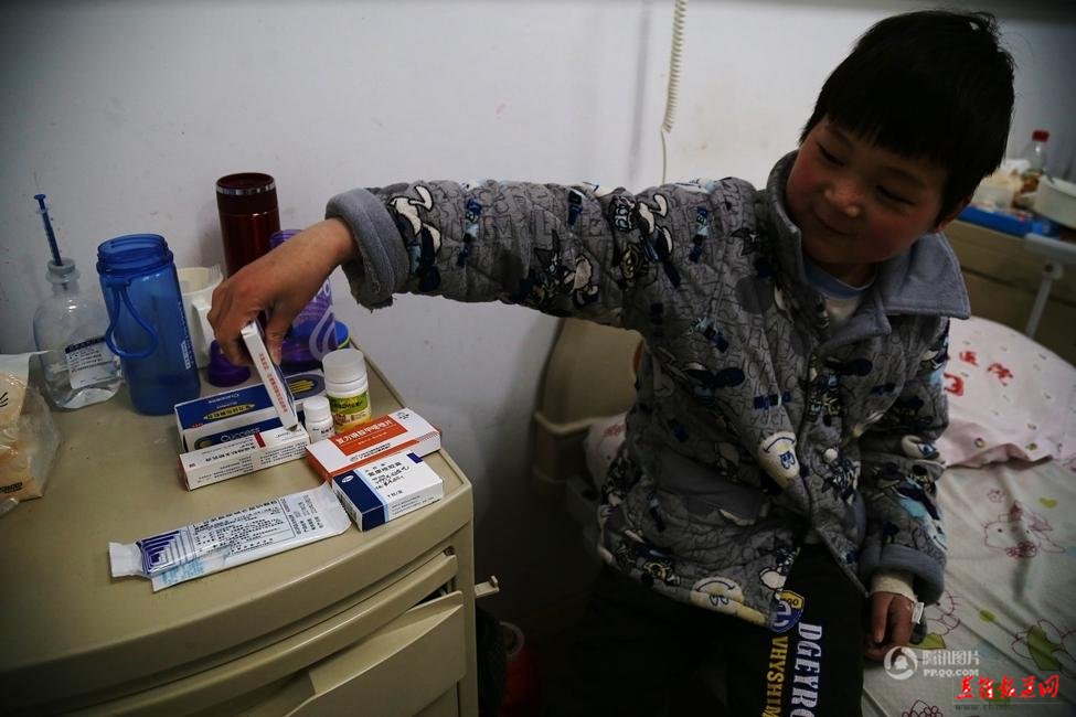 今年38岁的陈运涛家在亳州市谯城区立德乡马刘行政村。两个儿子,大的陈明浩,今年9岁,小的也已经5岁了。老婆在家带孩子种种地,陈运涛会泥瓦匠的手艺,农闲时在建筑工地盖房子,一个月也能赚一两千元,小日子虽不富,倒也温馨。2011年12月大儿子陈明浩被查出患有急性淋巴白血病,这个噩耗打破了一家人平静的生活。那一年的冬天,陈明浩频繁发烧,到省立医院检查后,确认是白血病,“当时就吓傻了。”图为对于一些熟悉的药物,小明浩笑着说他一点都不害怕吃药。 |