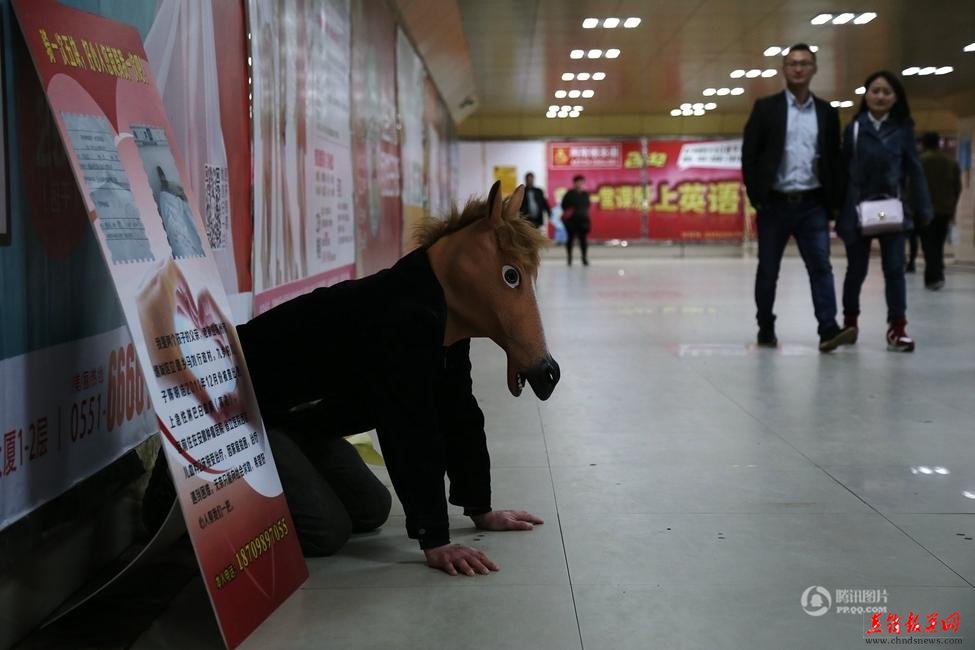 3月10日一早,父子俩还是带着跟亲友借的一万多元钱来到了省立医院西区化疗。化疗过程中,钱又用完了,已经跟亲友借不出钱的陈运涛想到了求助家乡的爱心志愿者。亳州爱心协会的志愿者给孩子募捐了8000多元钱送了过来,孩子才能继续治疗。这个疗程结束,医生说只要条件符合就可以脐带血移植。图为陈运涛在合肥逍遥津公园门口附近的地下通道了戴着头套,乞求市民在他身上骑一次,一次收费5元。 |