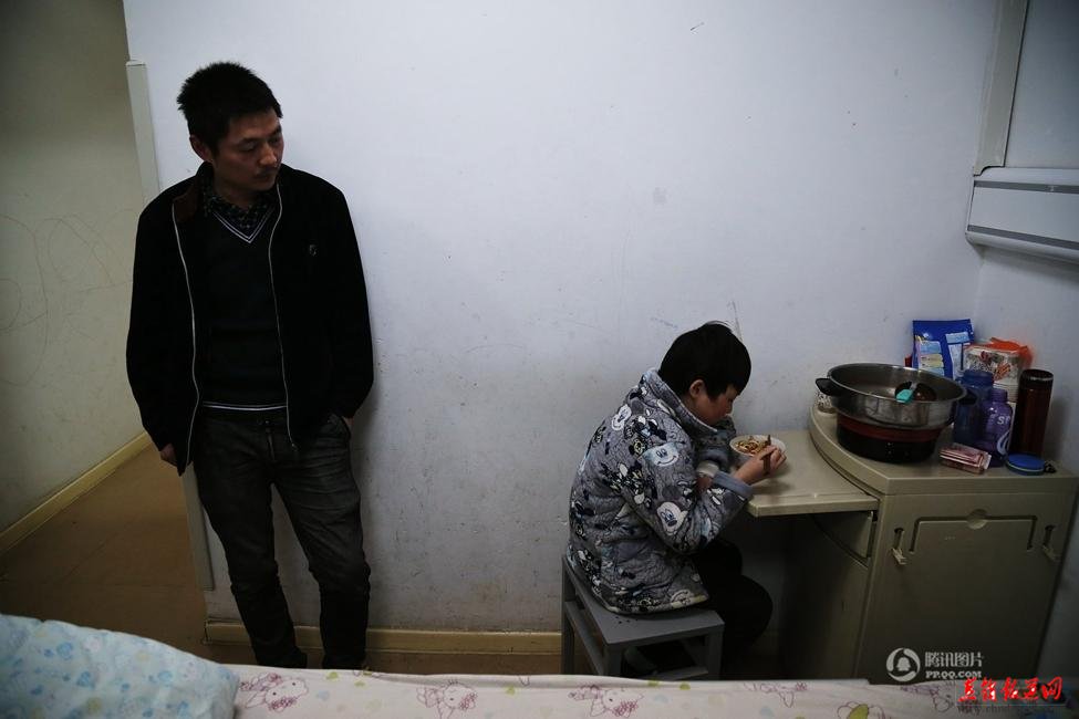 空着肚子的陈运涛看着小明浩认真地喝汤吃面,不时地提醒孩子吃慢一点。