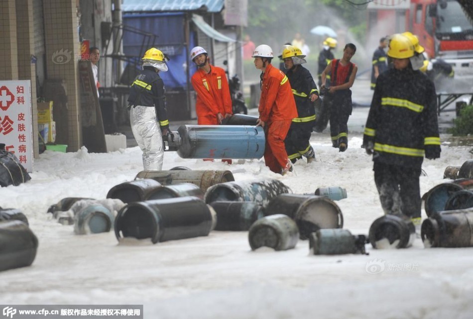 2010年9月11日下午3时许,广州市花都区新华镇一出租屋内发生煤气爆炸,这是一处煤气黑加工点,当时两名工人正将大瓶煤气置换到小瓶内,爆炸导致两名工人受伤,其中一人重伤。 消防员搬运煤气瓶。