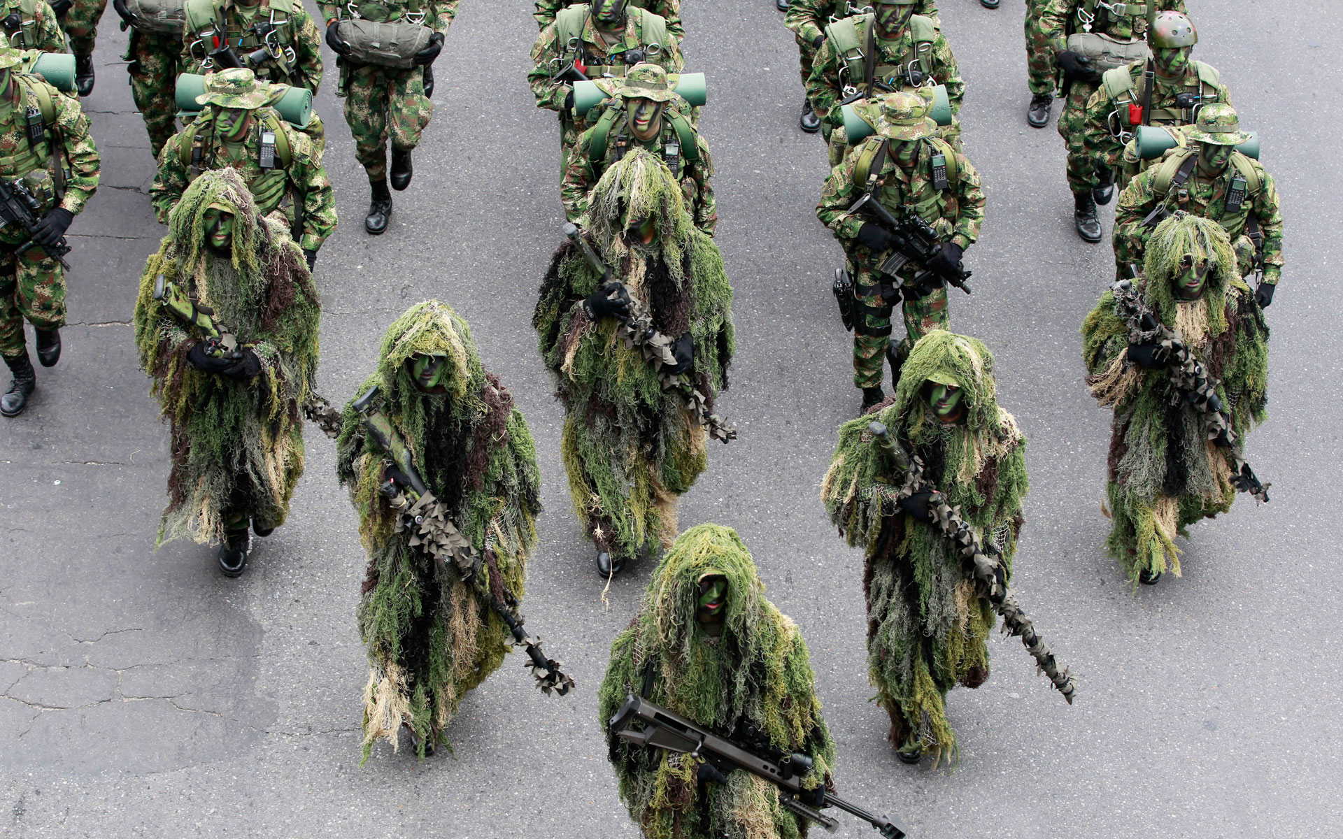 2013年7月20日,哥伦比亚独立日阅兵游行,一些士兵着伪装服走过。
