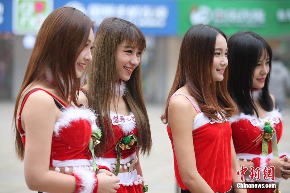 12月23日,四位短装打扮的南京美女走上街头,手举写有求抱抱字样的牌子寻求与路人拥抱,美丽冻人的形象引发路人的围观。