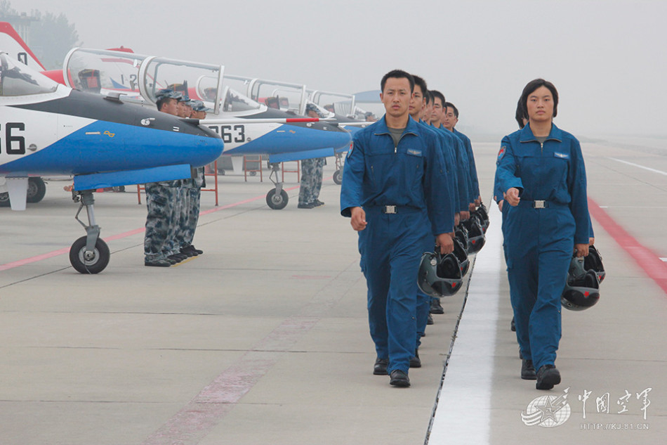 接收飞机 2012年10月,她们单飞了。伴随着绿色信号弹升空,她们以饱满的精神,高昂的士气走向战鹰,接收飞机、登机、打电门、启动发动机、请示、滑出、加速、起飞,一系列动作干脆利落,她们依次驾机冲向蓝天,独自驾驶高教机翱翔于4000米云天之上。 |