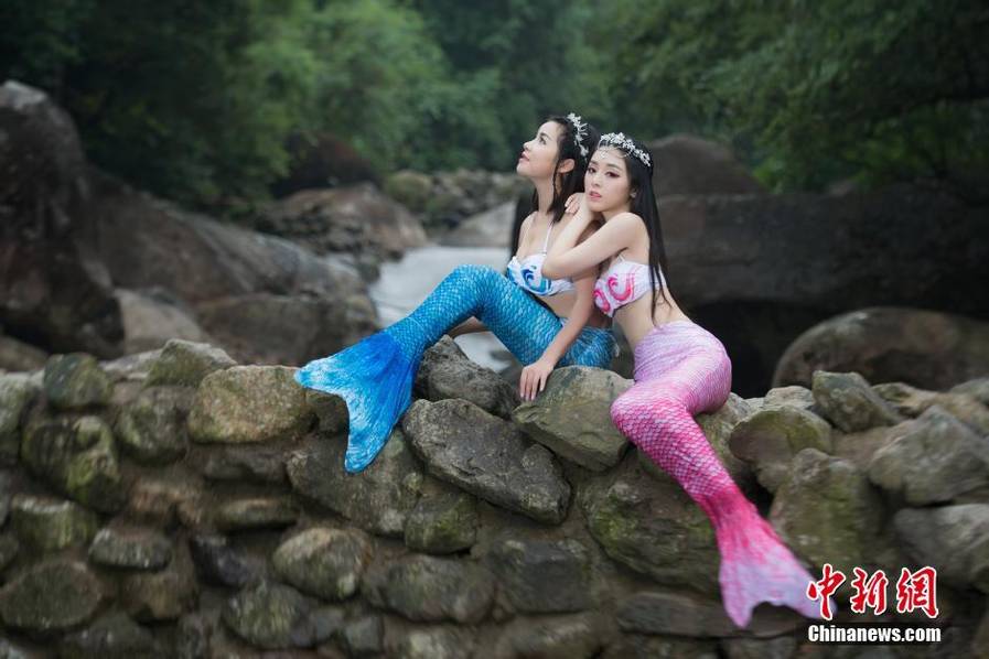 【直报网北京8月11日讯】(中新网)近日,在江西鹰潭龙虎山圣井山景区,厦门大学校花程熙媛和“网红”小孽上演了真人版“美人鱼Twins”。两位青春靓丽的姑娘扮成人鱼,一个身穿着红裙优雅文静,一个扮相“春丽”俏皮可爱,引来游人围观。 ▲