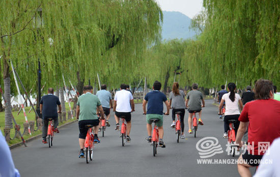 阿根廷总统马克里与夫人一行骑公共自行车游西湖。