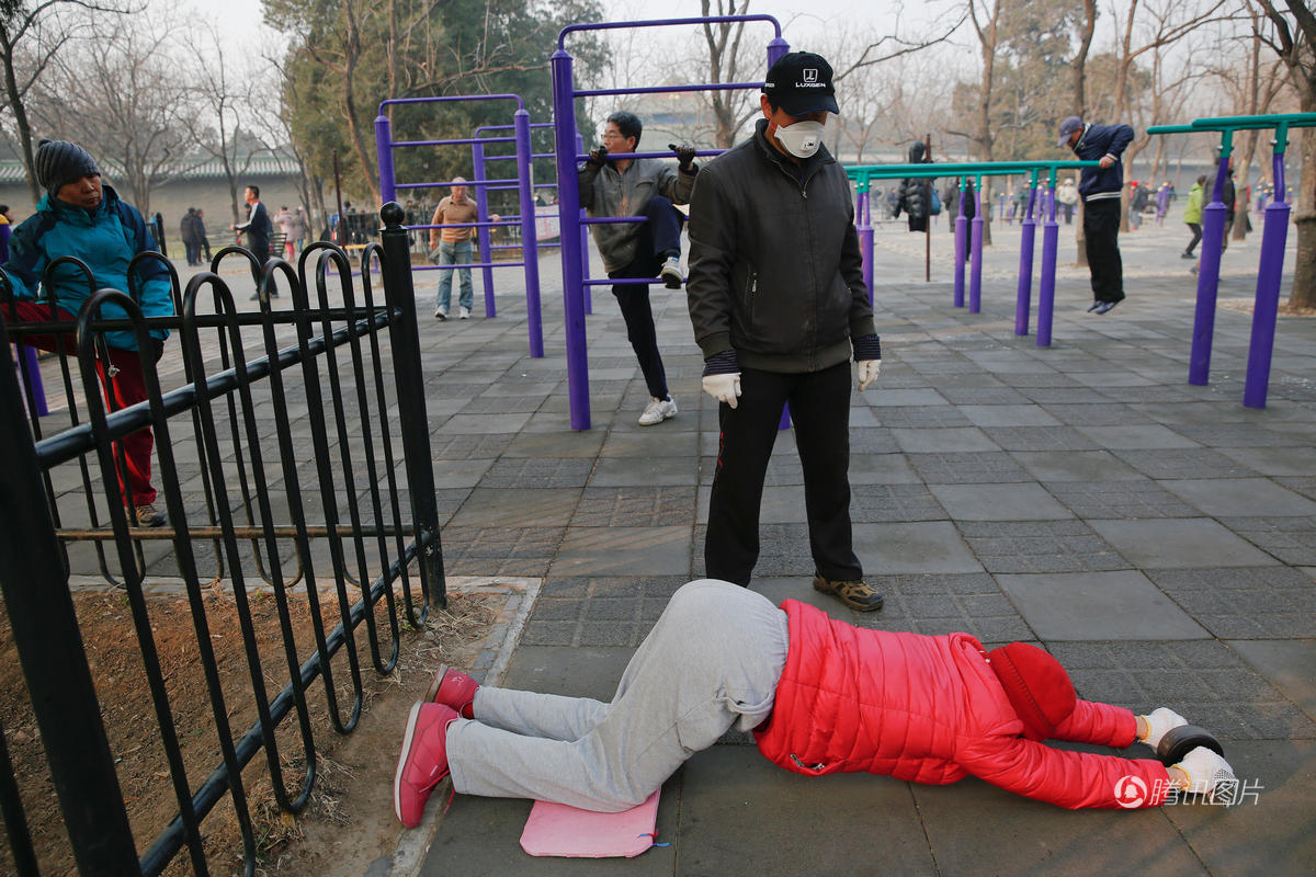 12月19日夜间至明天将是北京雾霾天气最严重的时段,北京继续实施单双号限行措施。在北京一所公园内,人们戴着口罩锻炼身体。