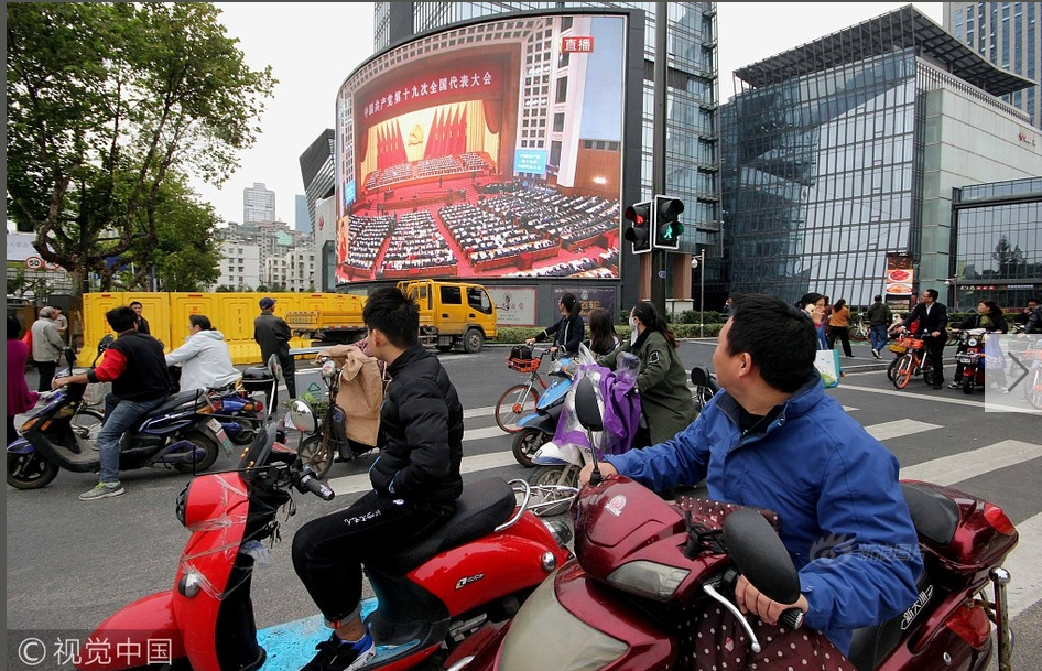 【社会各界人士观看十九大直播】2017年10月18日,南京,户外大屏前,众多市民驻足观看十九大开幕式直播。