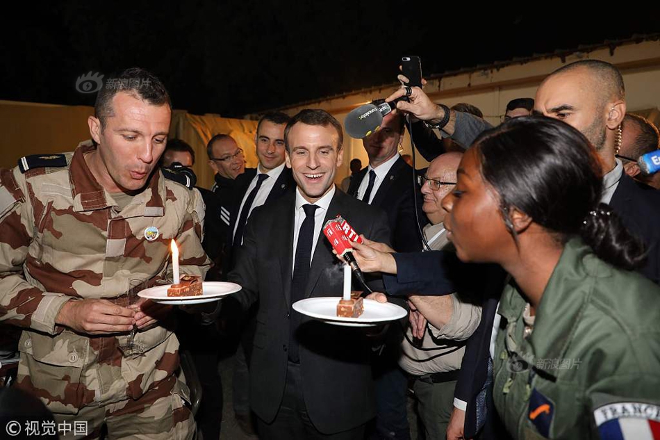 【马克龙到访乍得 与法国士兵共进晚餐】当地时间2018年12月22日,乍得恩贾梅纳,法国总统马克龙为两名法国士兵庆祝生日。马克龙在圣诞节前访问了在乍得的法国士兵,带来了足够1300名士兵享用的香槟、鹅肝酱和巧克力,与士兵共享。 |