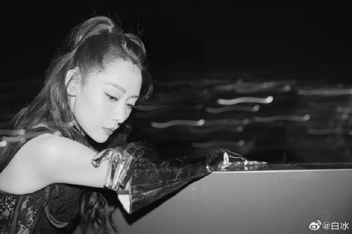 白冰黑色蕾丝上衣配金手套超飒(5)