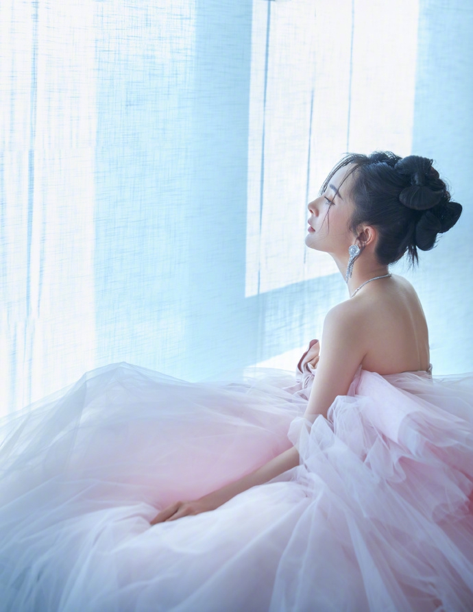 杨幂穿粉色抹胸裙仙气飘飘 头发扎蝴蝶结很少女(6)