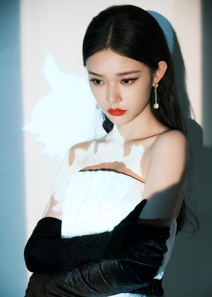 (原标题:林允白色氧气感抹胸长裙优雅 赫本风盘发黑色丝绒手套贵气)