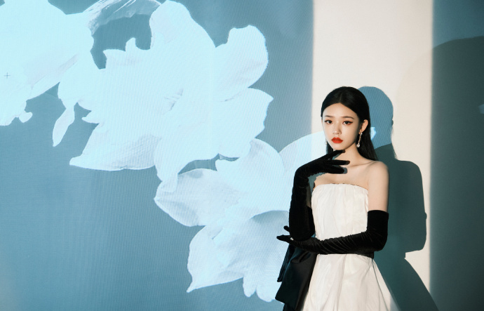 林允白色氧气感抹胸长裙优雅 赫本风盘发黑色丝绒手套贵气(3)