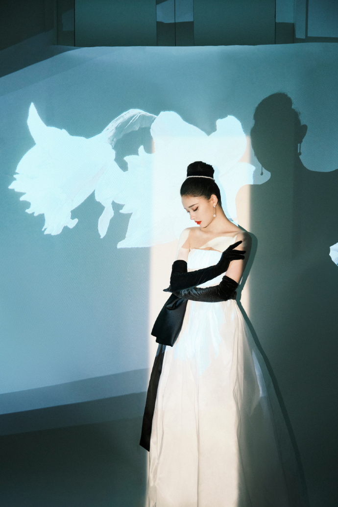 林允白色氧气感抹胸长裙优雅 赫本风盘发黑色丝绒手套贵气(6)