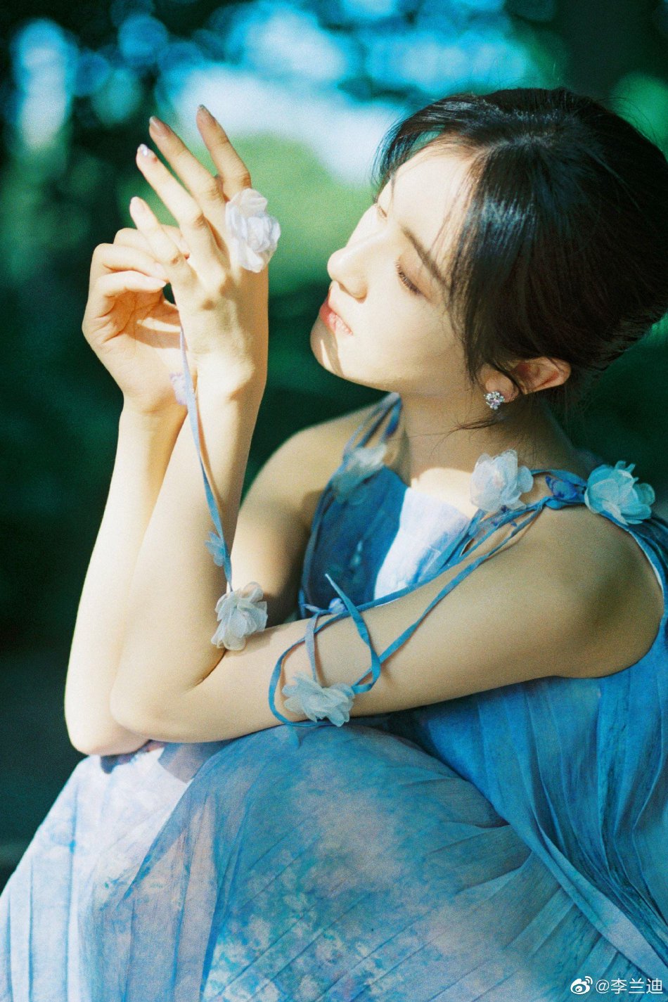 李兰迪着蓝色吊带裙清爽宜人 眼神深邃宛若画中仙(4)