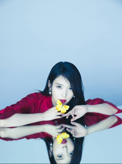 IU一抹红唇妖娆迷人 穿红色丝绸质衬衫皮肤白皙(4)