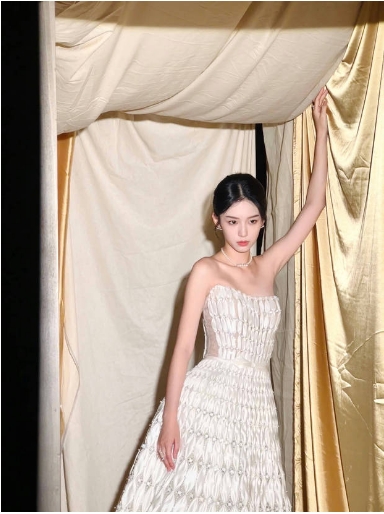 (原标题:周也着一袭白色抹胸连衣裙 贴头造型映衬精致头骨轮廓)