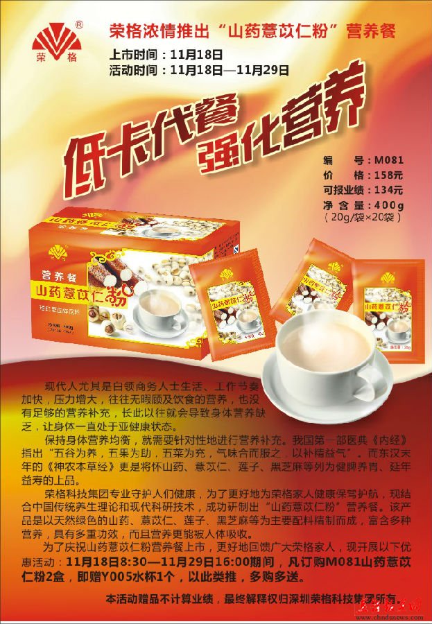 【直报网10月22日讯】(荣格)荣格科技集团山药薏苡仁粉营养餐即将上市。▲