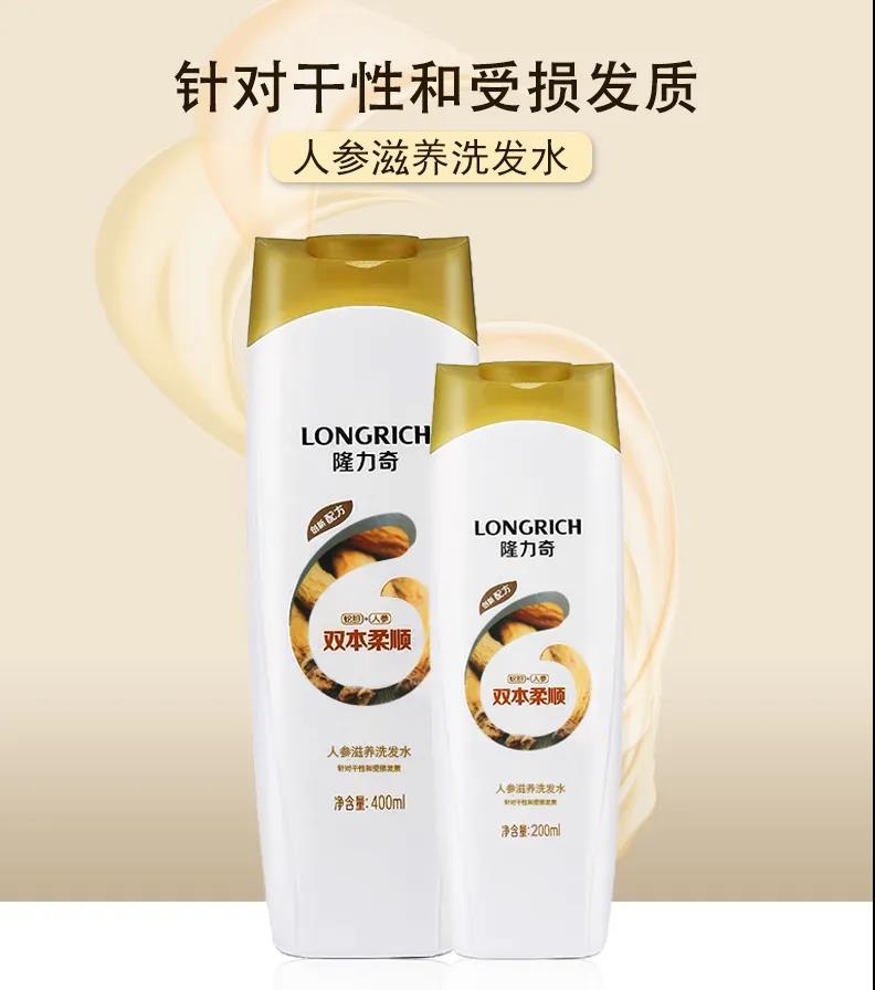 隆力奇人参洗发水针对干枯和受损发质研发,其成分人参精华可修护毛鳞片,保湿滋润,珍贵蛇胆提取物有丰富的微量元素铁,维生素C、E等,滋养头皮,形成保护膜。淡淡的香味,丰富的泡沫,清洗后清爽,顺滑。