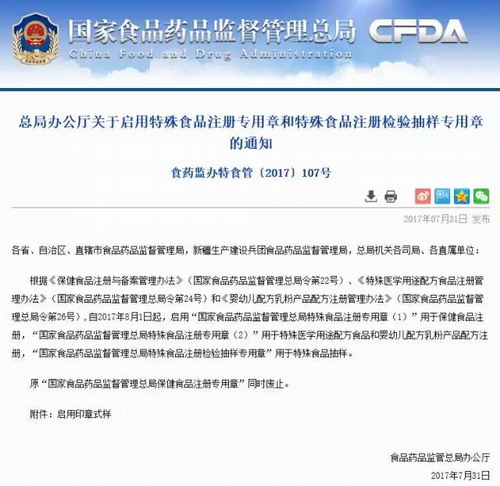 【直报网北京8月1日讯】(食药监)注意哦,“国家食品药品监督管理总局特殊食品注册专用章(1)”,用于保健食品注册,原章同时废止。 ![]() (原标题:CFDA启用特殊食品注册专用章 相关企业注意咯) 责任编辑:佟佟 解读新闻热点、呈现敏感事件、更多独家分析,尽在以下微信公号,扫描二维码免费阅读。