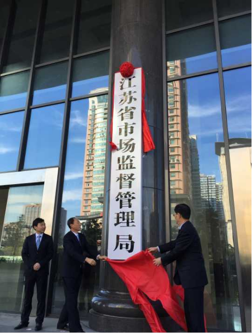 【直报网北京11月2日讯】(交汇点)11月2日上午,江苏省市场监督管理局正式挂牌。原省食品药品监督管理局党组书记、局长朱勤虎担任省市场监督管理局党组书记、局长。 根据《江苏省机构改革方案》,将省工商行政管理局、省质量技术监督局、省食品药品监督管理局(省食品安全委员会办公室)、省物价局的职责,以及省商务厅的打击侵犯知识产权和假冒伪劣商品、反垄断等有关职责整合,组建省市场监督管理局,作为省政府直属机构。对于新组建的江苏省市场监督管理局而言,挂牌仪式不仅仅是一个标志,更是一种向全社会的承诺,也是向全社会的宣誓。