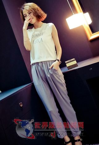 【直报网6月18日讯】(世界服装鞋帽网)无袖字母衫搭配灰色西服哈伦裤与细带凉鞋。上衣的清凉中和裤装带来的闷热感,浅色哈伦裤的搭配让整体风格在休闲之余不减正式与帅气质感,也是十分养眼的造型呢,很不错的。