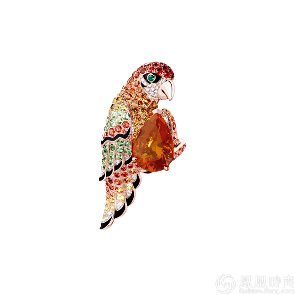 Boucheron宝诗龙Animal Collection动物系列Fuzzy豹猫戒指 豹猫有着狡黠的双眸和灵动的身姿,其独来独往桀骜不驯的野性使Boucheron宝诗龙视其为勇气与独立的象征。Fuzzy the Leopard Cat 豹猫玫瑰金戒指以金色为底色,香槟金钻石与黑色烤漆构成身上花斑,祖母绿宝石化为点睛之笔;衔尾戒指采取大胆个性的开放设计,另一款双头豹猫则镶有一枚电气石,盈盈绿色映衬下,仿佛豹猫穿梭于密林与草丛中。 Nuri the Parrot 鹦鹉 象征美丽与生命力