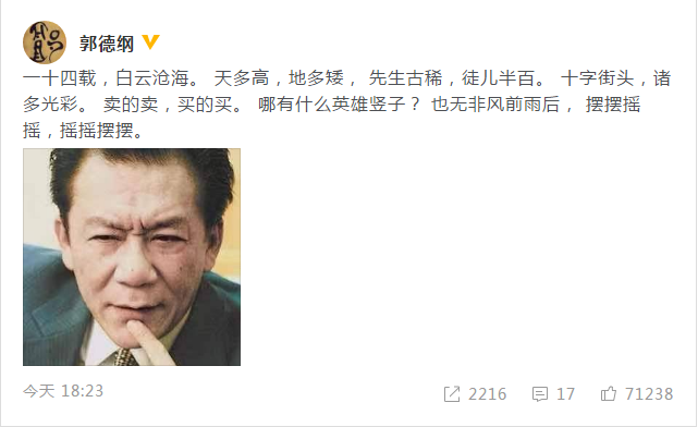 【直报网北京6月24日讯】(新浪娱乐)6月23日是侯耀文去世14周年,郭德纲发文缅怀恩师:“一十四载,白云沧海。天多高,地多矮,先生古稀,徒儿半百。十字街头,诸多光彩。卖的卖,买的买。哪有什么英雄竖子?也无非风前雨后,摆摆摇摇,摇摇摆摆。”据悉,2007年6月23日,侯耀文因突发心脏病病逝北京,享年59岁。 (原标题:侯耀文逝世14周年 郭德纲发文缅怀恩师) 责编:小美 【特别声明:部分文字及图片来源于网络,仅供学习和交流使用,不具有任何商业用途,其目的在于传递更多的信息,并不代表本平台赞同其观点。版权归原作者所有,如涉版权或来源标注有误,请及时和我们取得联系,我们将迅速处理,谢谢!】 解读新闻热点、呈现敏感事件、更多独家分析,尽在以下微信公号,扫描二维码免费阅读。