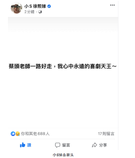 事实上,蔡头过去登上《康熙来了》节目时,表示自己拥有看人前世的能力,一眼就看出小S的前世是韦小宝,而蔡康永的前世则是慈禧太后,虽然当时嘉宾听了各个都面有难色,但蔡头逗趣又直率的性格已经圈粉了许多电视机前的观众,因此他离世的消息传出后,也让许多网友纷纷表示惋惜“一直很喜欢蔡头说”、“很喜欢他带来的笑果”、“希望他一路好走”。(ETtoday/ 文) (原标题:小S悼念蔡头:一路走好 我心中永远的喜剧天王) 责编:小美 【特别声明:部分文字及图片来源于网络,仅供学习和交流使用,不具有任何商业用途,其目的在于传递更多的信息,并不代表本平台赞同其观点。版权归原作者所有,如涉版权或来源标注有误,请及时和我们取得联系,我们将迅速处理,谢谢!】 解读新闻热点、呈现敏感事件、更多独家分析,尽在以下微信公号,扫描二维码免费阅读。